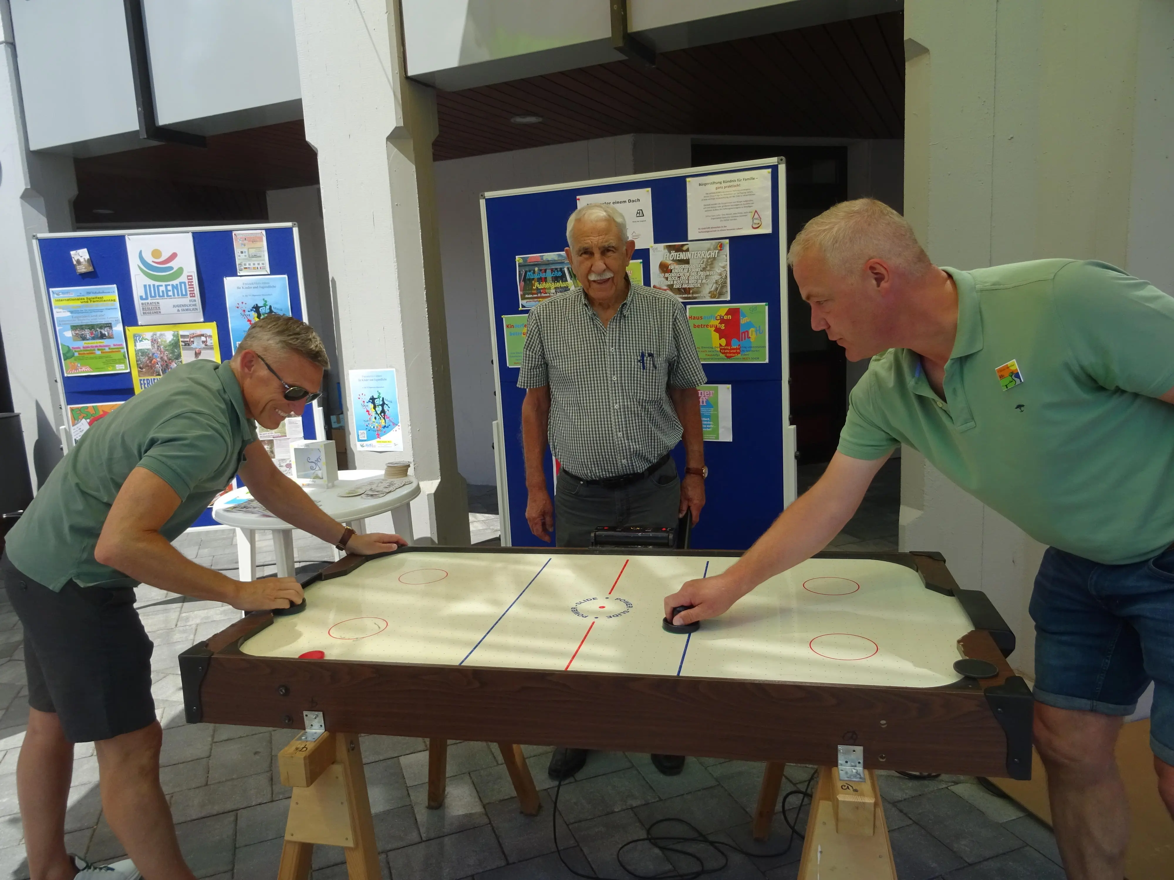 Landrat Ralf Leßmeister (links) und Stadt- und Verbandsgemeindebürgermeister Ralf Hechler (rechts) spielen gegeneinander. „Schiedsrichter“ ist der Migrationsbeauftragte des Landkreises Kaiserslautern, Sofronios Spytalimakis (mitte).